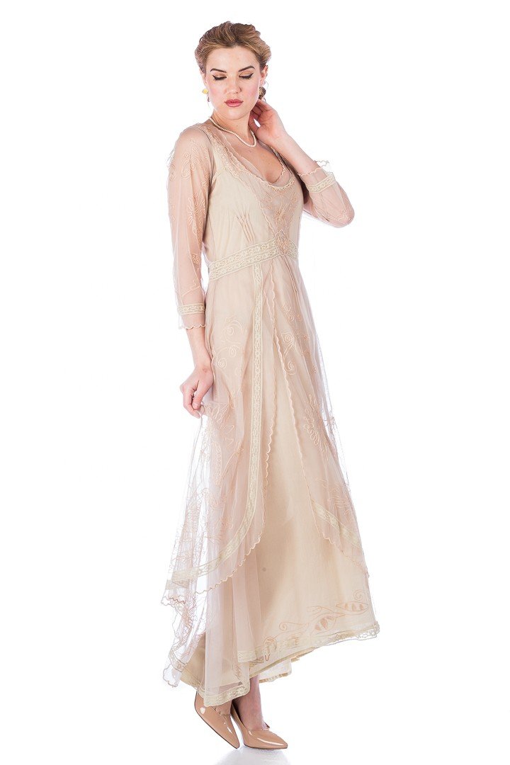 Embroidery Type/Decoration: Layered styling, English chain stitch embroidery, scallops, lace inserts, silk stitch embroidery, applique, A-line