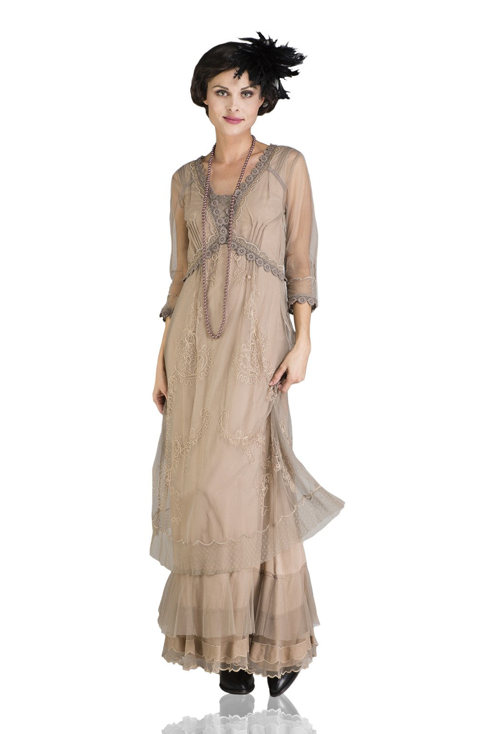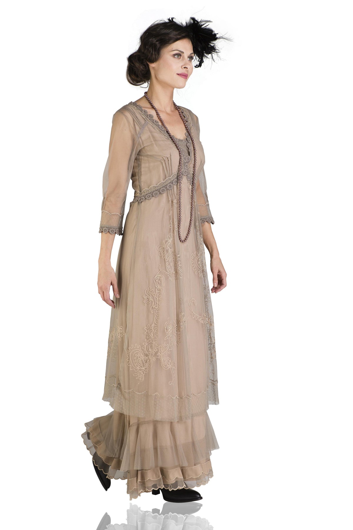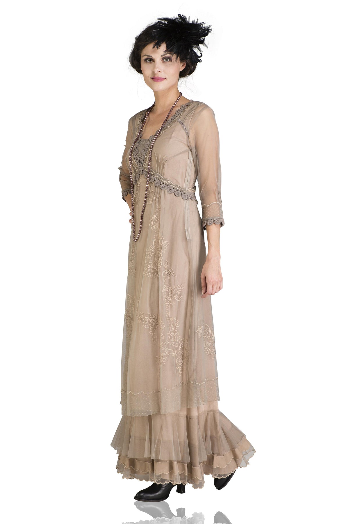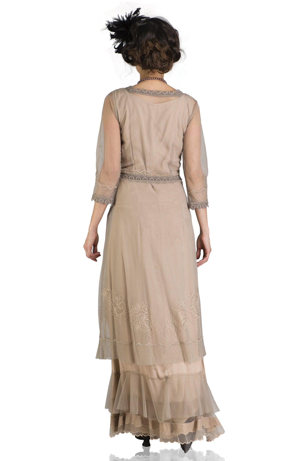Embroidery Type/Decoration: Empire yoke framed with Venetian lace, layered styling with mirrored chain stitch embroidery, circular layered underlayer, scalloped edge, bust contoured tucks